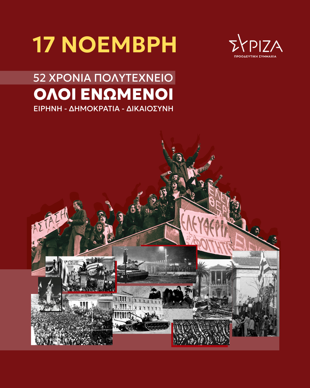 Η Νομαρχιακή Επιτροπή Αιτωλοακαρνανίας του ΣΥΡΙΖΑ – Προοδευτική Συμμαχία τιμά την 52η επέτειο της εξέγερσης του Πολυτεχνείου. Η εξέγερση των φοιτητών και του λαού το Νοέμβρη του ’73 παραμένει φάρος αντίστασης απέναντι σε κάθε μορφή αυταρχισμού, κοινωνικής αδικίας και περιορισμού της δημοκρατίας. Το διαχρονικό σύνθημα «Ψωμί – Παιδεία – Ελευθερία» εξακολουθεί να συμπυκνώνει τις ανάγκες και τα αιτήματα της νέας γενιάς.