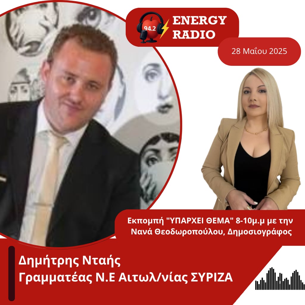 Ο Γραμματέας του ΣΥΡΙΖΑ Αιτωλ/νίας Δημήτρης Νταής σε συνέντευξή του στην δημοσιογράφο Νανά Θεοδωροπούλου, στην εκπομπή «ΥΠΑΡΧΕΙ ΘΕΜΑ» στον Energy 94.2 αναφέρθηκε στο συνέδριο που θα πραγματοποιηθεί 12-15 Ιουνίου στο Δημοτικό Γυμναστήριο Μπάσκετ Περιστερίου, στην διαδικασία που είναι σε εξέλιξη για την κατάθεση υποψηφιοτήτων καθώς και στις γενικότερες διεργασίες στην κεντροαριστερά όπως και στις πληροφορίες που φουντώνουν περί πιθανής επιστροφής του Αλέξη Τσίπρα.