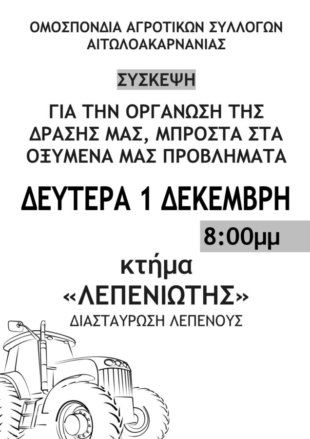 Σύσκεψη για την οργάνωση της δράσης κτηνοτρόφων και αγροτών, για τα οξυμένα προβλήματα που αντιμετωπίζουμε, θα πραγματοποιηθεί με πρωτοβουλία της Ομοσπονδίας Αγροτικών Συλλόγων Αιτωλοακαρνανίας, στη Λεπενού, τη Δευτέρα 1 Δεκέμβρη, στις 8:00μμ, στο κτήμα «ΛΕΠΕΝΙΩΤΗ».