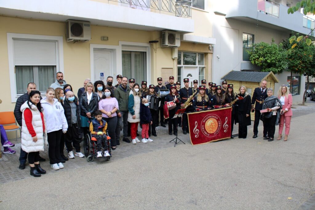 Στη συνέχεια, τα μέλη της Δημοτικής Φιλαρμονικής, όπως και στις περσινές γιορτές, μετέβησαν στο Σύλλογο Γονιών Παιδιών με Νεοπλασματική Ασθένεια «Η Φλόγα». Εκεί έπαιξαν τα κάλαντα και άλλα εορταστικά μουσικά κομμάτια για τα παιδάκια που συγκεντρώθηκαν να τους ακούσουν. Μετά το τέλος του προγράμματος, οι μαθητές της Φιλαρμονικής δώρισαν στο Σύλλογο ένα συμβολικό χρηματικό ποσό που συγκέντρωσαν οι ίδιοι, ενώ έλαβαν αναμνηστικά δώρα από την Πρόεδρο της «Φλόγας» Μαρία Τρυφωνίδη.