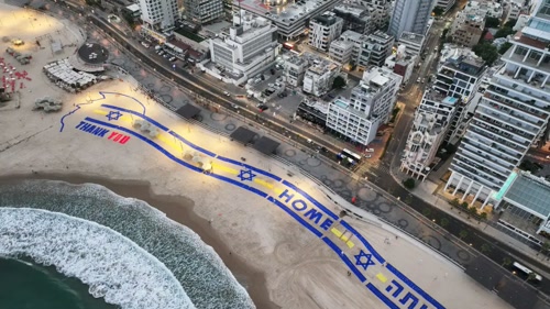 Ένα τεράστιο πανό ευγνωμοσύνης προς τον πρόεδρο των Ηνωμένων Πολιτειών, Ντόναλντ Τραμπ βρίσκεται στην παραλία του Τελ Αβίβ, σύμφωνα με πλάνα που προβλήθηκαν από ισραηλινά ΜΜΕ, κι ενώ σε εξέλιξη βρίσκεται η διαδικασία απελευθέρωσης των ομήρων της Χαμάς, με βάση τη συμφωνία εκεχειρίας Ισραήλ – Χαμάς.