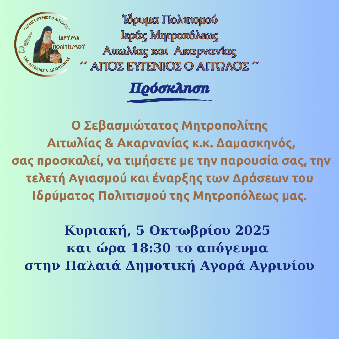 Την προσεχή Κυρικαή, 5 Οκτωβρίου 2025 και ώρα 6:30 το απόγευμα, στην αίθουσα της Παλαιάς Δημοτικής Αγοράς Αγρινίου, θα πραγματοποιηθεί  από τον Σεβασμιώτατο Μητροπολίτη Αιτωλίας και Ακαρνανίας κ. Δαμασκηνό. η τέλεση του Αγιασμού για την έναρξη των φετινών μαθημάτων και δράσεων του Ιδρύματος Πολιτισμού της Τοπικής μας Εκκλησίας  «ΑΓΙΟΣ ΕΥΓΕΝΙΟΣ Ο ΑΙΤΩΛΟΣ΄».