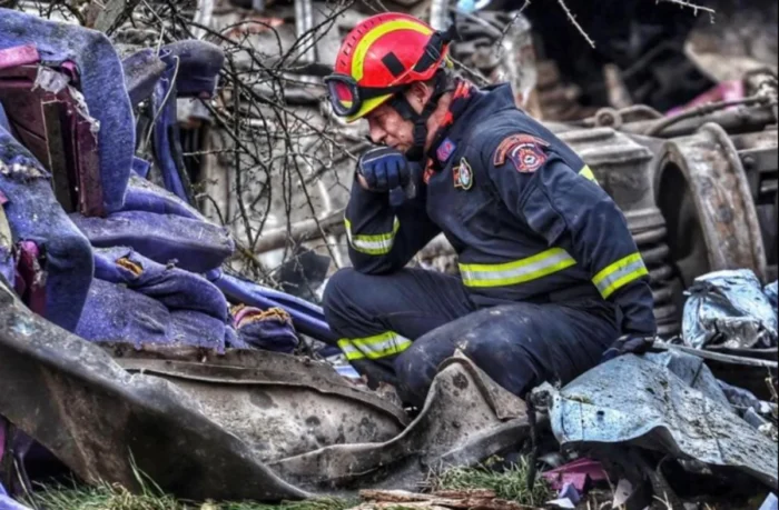 Ένας άνδρας της ΕΜΑΚ λυγίζει και σκύβει το κεφάλι από πόνο για όσα αντίκρισε στα Τέμπη, στο σιδηροδρομικό δυστύχημα με τους 57 – έως τώρα – νεκρούς.