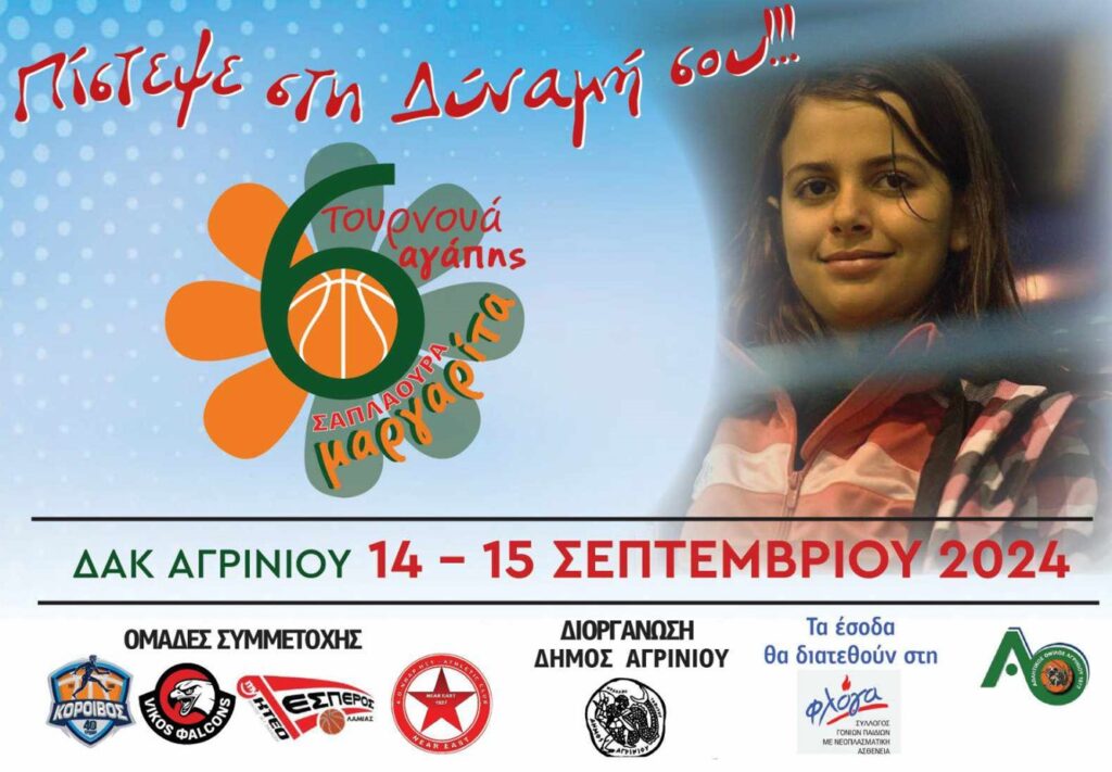 Για 6η συνεχόμενη χρονιά θα διοργανωθεί από το Δήμο Αγρινίου σε συνεργασία με τον Α.Ο. Αγρινίου το τουρνουά αγάπης “Μαργαρίτα Σαπλαούρα”.Το τουρνουά που αποτελεί θεσμό για το μπάσκετ της πόλης μας θα διοργανωθεί στο κλειστό του ΔΑΚ Αγρινίου “Μιχάλης Κούσης” το Σαββατοκύριακο 14 και 15 Σεπτεμβρίου.Στο τουρνουά θα λάβουν μέρος τέσσερις ομάδες της Elite League “Ερρίκος Ντυνάν” και συγκεκριμένα ο Κόροιβος Αμαλιάδας, οι Vikos Φalcons, ο Έσπερος Λαμίας και η Νήαρ Ηστ.Για 6η συνεχόμενη χρονιά θα είμαστε εκεί για τη δική μας Μαργαρίτα που έφυγε από τη ζωή το Μάιο του 2018.Το όραμα του Περικλή Γερμανού και του Ντίνου Τσιαμάκη συνεχίστηκε και τα επόμενα χρόνια από το Θανάση Κόκκιο και το Νίκο Τσιαμάκη με την απόλυτη στήριξη από το Δήμο Αγρινίου.Πλέον δεν είναι θεσμός μόνο για εμάς αλλά και για τη Δημοτική Αρχή της πόλης μας.Μαζί μας θα είναι και πάλι ο Σύλλογος Γονιών Παιδιών με Νεοπλασματική Ασθένεια “ΦΛΟΓΑ”, στον οποίο θα διατεθούν όλα τα έσοδα της διοργάνωσης.Τις προσεχείς ημέρες θα γίνει γνωστό το πρόγραμμα των αγώνων του τουρνουά καθώς και τα σημεία διάθεσης των εισιτηρίων.Θα είμαστε όλοι εκεί για τη ΦΛΟΓΑ και τη Μαργαρίτα…
