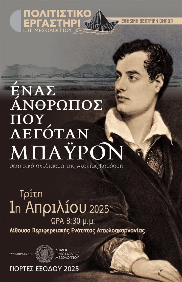 Η εφηβική ομάδα του Πολιτιστικού Εργαστηρίου του Δήμου Ιερής Πόλης Μεσολογγίου σας προσκαλεί στο θεατρικό σχεδίασμα της Ακακίας Κορδόση «Ένας άνθρωπος που λεγόταν Μπάιρον», σήμερα Τρίτη, 1 Απριλίου 2025 στις 20:30 στην αίθουσα εκδηλώσεων της Περιφερειακής Ενότητα Αιτωλοακαρνανίας (Κύπρου 30, Μεσολόγγι).