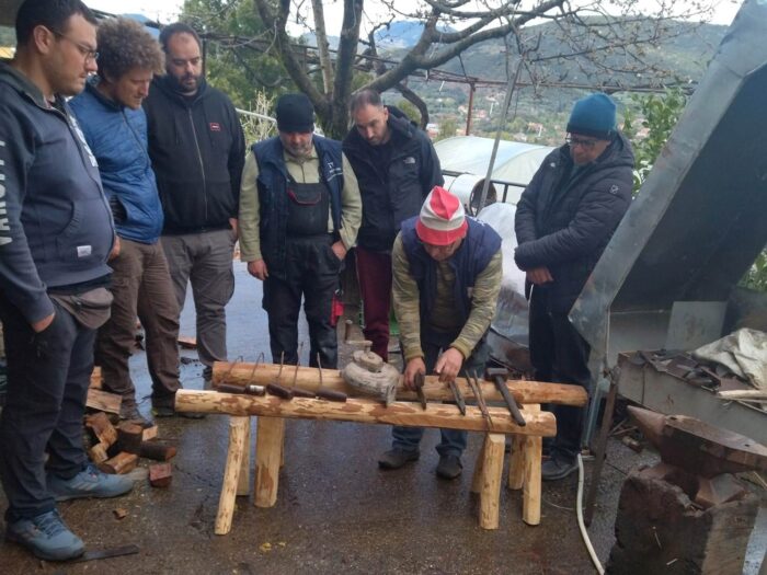 Ο δάσκαλος Βασίλης Χολέβας και οι έξι μαθητευόμενοι κατασκεύασαν τα σιδερένια εξαρτήματα του νερόμυλου με τον παραδοσιακό τρόπο στο καμίνι.Τα εξαρτήματα θα χρησιμοποιηθούν στα μαθηματα ανακατασκευής νερομυλου στο μύλο της Κασσάνδρας.