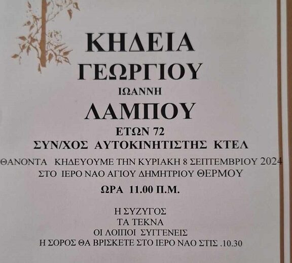 Με βαθιά θλίψη πληροφορήθηκα την εκδημία του συνταξιούχου αυτοκινητιστού και παλαιού αυτοδιοικητικού -πρώην προέδρου της Κοινότητας Διασελακίου- Γεωργίου Λάμπου. Πολύτεκνος πατέρας , καλός οικογενειάρχης και μαχητικός αυτοδιοικητικός .