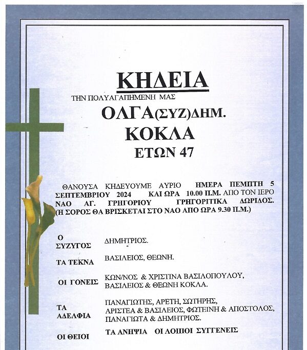 Θλίψη στη Ναύπακτο και στην Δωρίδα για τον πρόωρο θάνατο της Όλγας, μητέρα δύο παιδιών που έφυγε πρόωρα από την ζωή σε ηλικία 47 χρόνων.