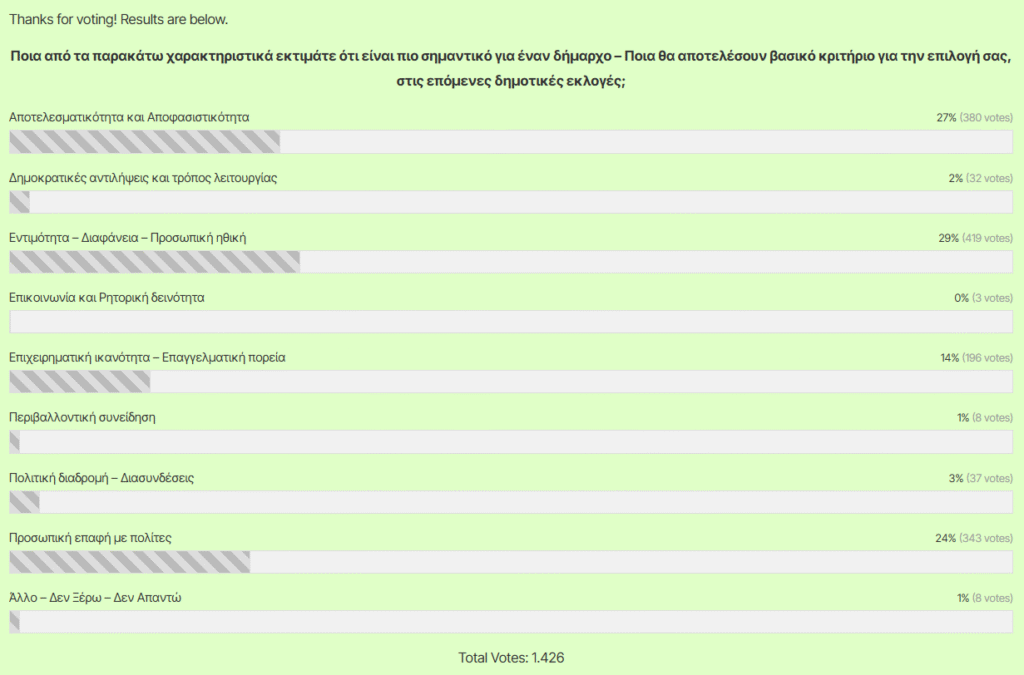 Ο πολύ μεγάλος αριθμός των συμμετοχών, επιτρέπει ασφαλή συμπεράσματα για το πως οι πολίτες αντιλαμβάνονται τον ίδιο το ρόλο του δημάρχου! Η εντιμότητα, η διαφάνεια και η προσωπική ηθική αξιολογήθηκαν, σε ποσοστό 29% και 419 ψήφους ως το πλέον σημαντικό κριτήριο αξιολόγησης, με την αποτελεσματικότητα και την αποφασιστικότητα να ακολουθούν με 380 ψήφους και ποσοστό 27%. Έπεται η προσωπική επαφή με τους πολίτες, που συγκέντρωσε 343 ψήφους και ποσοστό 24%.