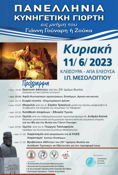 Η Κυνηγετική Συνομοσπονδία Ελλάδας, η Δ’ Κυνηγετική Ομοσπονδία Στερεάς Ελλάδας, ο Κυνηγετικός Σύλλογος Μεσολογγίου σε συνεργασία με τον Σύλλογο Δρομέων Υγείας Αιτωλικού και την Αρωγή της Περιφέρειας Δυτικής Ελλάδας σας προσκαλούν να τιμήσετε με την παρουσία σας την Πανελλήνια Κυνηγετική Γιορτή που θα γίνει την Κυριακή 11/6/2023 και ώρα 20:00 στην Κλεισούρα – Αγία Ελεούσα Ι.Π Μεσολογγίου (Εκκίνηση Αθλητών για τον 25ο Δρόμο Θυσίας ώρα 18¨45 ,σημείο Εκκίνησης δυτική γέφυρα Αιτωλικού) σε μνήμη του Ήρωα Κυνηγού και Σωτήρα του Μεσολογγίου ”Γιάννη Γούναρη ή Ζούκα ”.