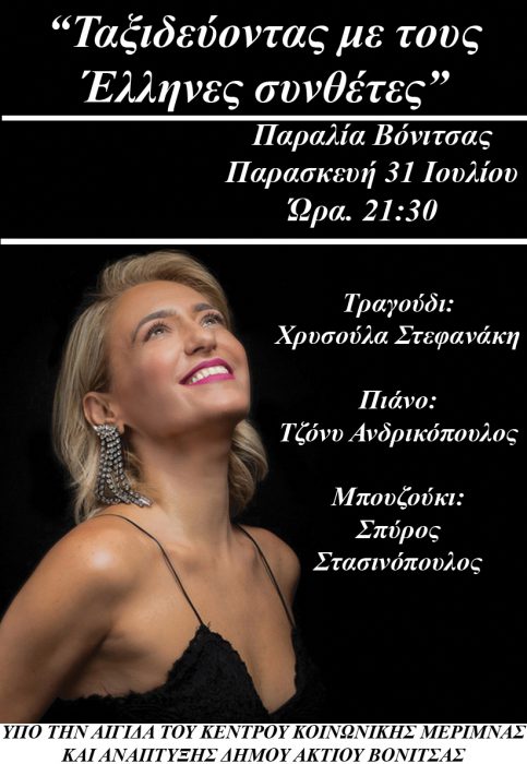 Στις 31 Ιουλίου στην παραλία της Βόνιτσας από την Χρυσούλα Στεφανάκη θα απολαύσουμε τραγούδια – διαμάντια από την ελληνική δισκογραφία, παλιότερη και σύγχρονη, συνθετών και τραγουδιστών (Γιάννης Σπανός, Γιώργος Χατζηνάσιος, Μίμης Πλέσσας, Βίκυ Μοσχολιού, Δημήτρης Μητροπάνος, Σταμάτη Κραουνάκη και άλλους), που η ίδια η ερμηνεύτρια συνεργάστηκε μαζί τους.