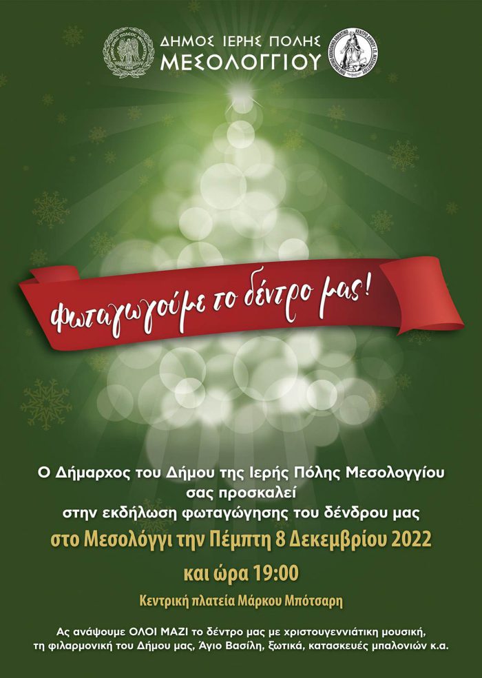 Οι εκδηλώσεις ξεκινούν με την εντυπωσιακή φωταγώγηση του Χριστουγεννιάτικου Δέντρου στη Πλατεία Μάρκου Μπότσαρη (Κεντρική Πλατεία Μεσολογγίου), την Πέμπτη, 8 Δεκεμβρίου 2022 στις 7:00 μ.μ. με χριστουγεννιάτικα ακούσματα από την Δημοτική Φιλαρμονική «Χ. Καψάλης» την συμμετοχή των ΚΔΑΠ και τη χορωδία του Δήμου μας. Οι μικροί μας φίλοι θα διασκεδάσουν με τον Άγιο Βασίλη τα ξωτικά και πολλές ακόμη εκπλήξεις.