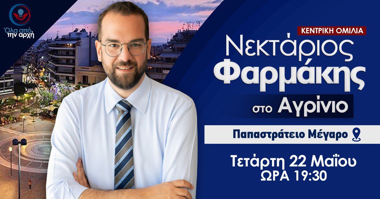 Η ομιλία του θα πραγματοποιηθεί στις 7.30 μ.μ. της Τετάρτης 22 Μαΐου 2019 στο Παπαστράτειο Μέγαρο, με τον κ. Φαρμάκη να στέλνει μήνυμα πολιτικής αλλαγής και ανανέωσης σε όλη τη Δυτική Ελλάδα, θέτοντας παράλληλα τις προτεραιότητες της παράταξής του για την Αιτωλοακαρνανία και υπογραμμίζοντας την ανάγκη, η Δυτική Ελλάδα να καλύψει το χαμένο έδαφος και τον χαμένο χρόνο.
