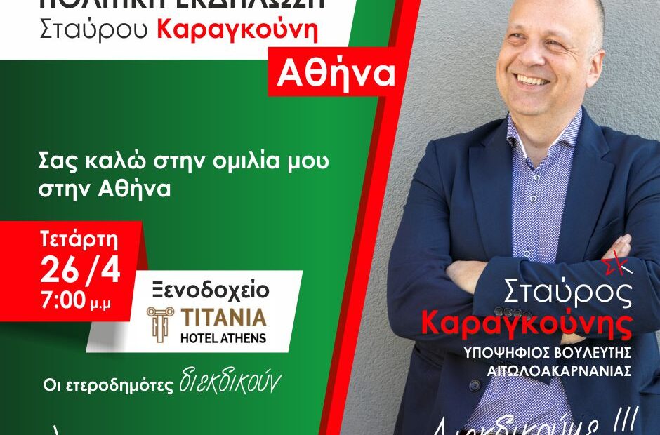 Την Τετάρτη 26 Απριλίου και ώρα 19.00 μμ. θα πραγματοποιηθεί στο ξενοδοχείο ΤΙΤΑΝΙΑ (Πανεπιστημίου 52) η κεντρική προεκλογική ομιλία του υποψηφίου βουλευτή του ΣΥΡΙΖΑ – Προοδευτική Συμμαχία Σταύρου Καραγκούνη.