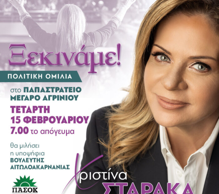 Σε πλήρεις προεκλογικούς ρυθμούς η υποψήφια βουλευτής Αιτωλοακαρνανίας του ΠΑΣΟΚ – Κίνημα Αλλαγής, Χριστίνα Σταρακά, πραγματοποιεί την πρώτη της ανοιχτή συγκέντρωση και πολιτική ομιλία την Τετάρτη 15/2, στις 7:00 το απόγευμα, στο Παπαστράτειο.