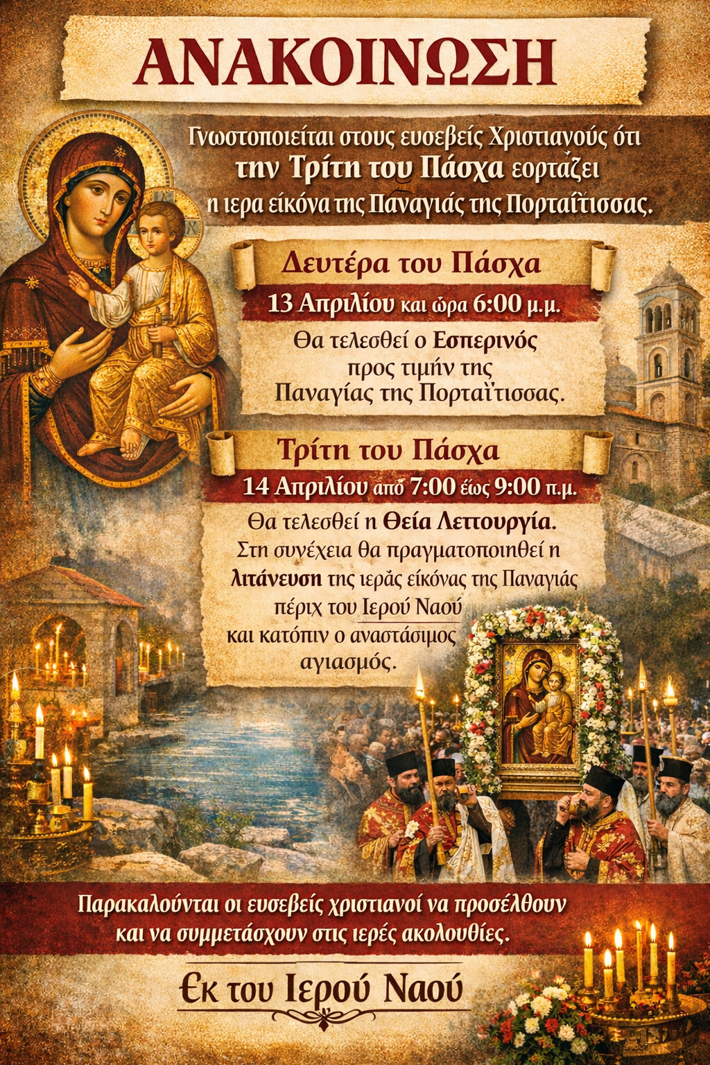 13 Απριλίου και ώρα 6:00 μ.μ. θα τελεσθεί ο Εσπερινός προς τιμήν της Παναγίας της Πορταΐτισσας.