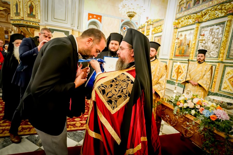 Ο Σεβασμιώτατος Μητροπολίτης Αιτωλίας και Ακαρνανίας αμέσως μετά, απένειμε την Ανώτατη Τιμητική Διάκριση της Ιεράς Μητροπόλεως Αιτωλίας και Ακαρνανίας, ήτοι τον Χρυσούν Σταυρόν μετά Μεταλλίου, στον Εντιμώτατο κ. Νεκτάριο Φαρμάκη, Περιφερειάρχη Δυτικής Ελλάδας για την μεγάλη και πολλαπλή συμβολή του στην ανακαίνιση του Ιερού Μητροπολιτικού Ναού.