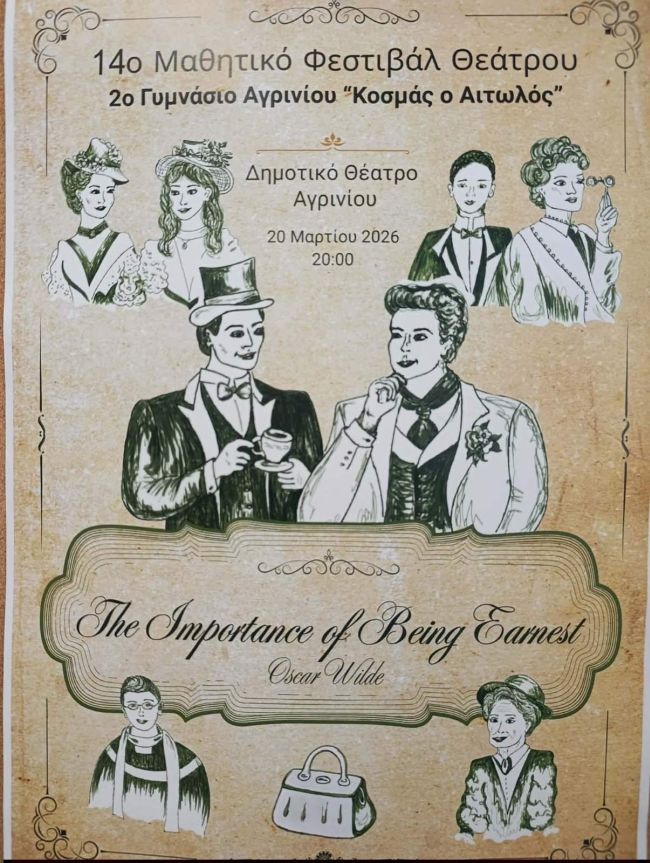 Το 2ο Γυμνάσιο Αγρινίου λαμβάνει μέρος στο 14ο Πανελλήνιο Μαθητικό Φεστιβάλ Θεάτρου, παρουσιάζοντας το κλασικό έργο «The Importance of BeingEarnest» του OscarWilde, ενός από τους σημαντικότερους εκπροσώπους της αγγλικής δραματουργίας.