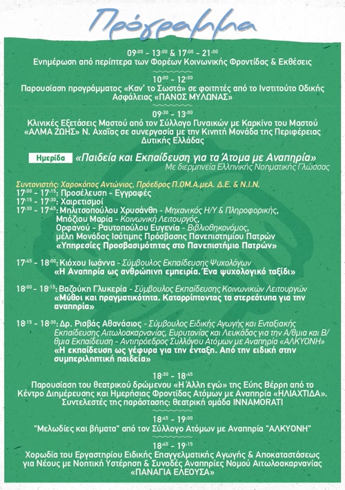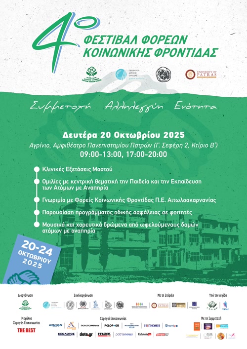 Το Φεστιβάλ, που πραγματοποιείται στο κτίριο Β’ του Πανεπιστημίου Πατρών στο Αγρίνιο, έχει ως στόχο την ενημέρωση, τη συνεργασία και την ευαισθητοποίηση της κοινωνίας γύρω από θέματα αναπηρίας, κοινωνικής φροντίδας και ένταξης.
