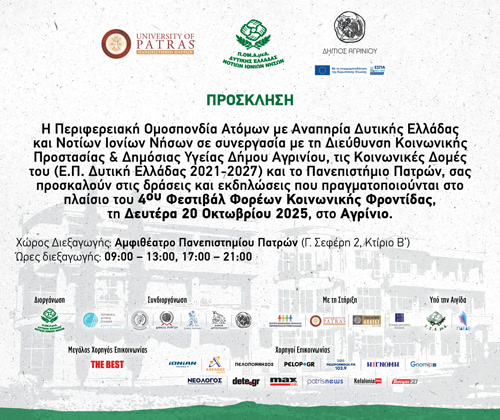 Με πρώτο σταθμό το Αγρίνιο, ανοίγει τη Δευτέρα 20 Οκτωβρίου 2025 τις πύλες του το 4ο Φεστιβάλ Φορέων Κοινωνικής Φροντίδας της Περιφερειακής Ομοσπονδίας Ατόμων με Αναπηρία Δυτικής Ελλάδας και Νοτίων Ιονίων Νήσων (Π.ΟΜ.Α.μεΑ. Δ.Ε. & Ν.Ι.Ν.).