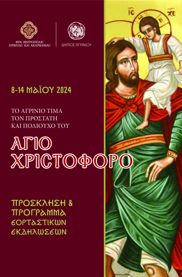 Ὁ Σεβασμιώτατος Μητροπολίτης Αιτωλίας & Ακαρνανίας κ.κ. Δαμασκηνὸς και ο Δήμαρχος Αγρινίου κ. Γεώργιος Παπαναστασίου σας προσκαλούν στις εορταστικές και λατρευτικές εκδηλώσεις προς τιμήν του Αγίου Ενδόξου Μεγαλομάρτυρος Χριστοφόρου, Προστάτου καὶ Πολιούχου της πόλεως του Αγρινίου, οι οποίες θα πραγματοποιηθούν από 8 έως 14 Μαΐου 2024.