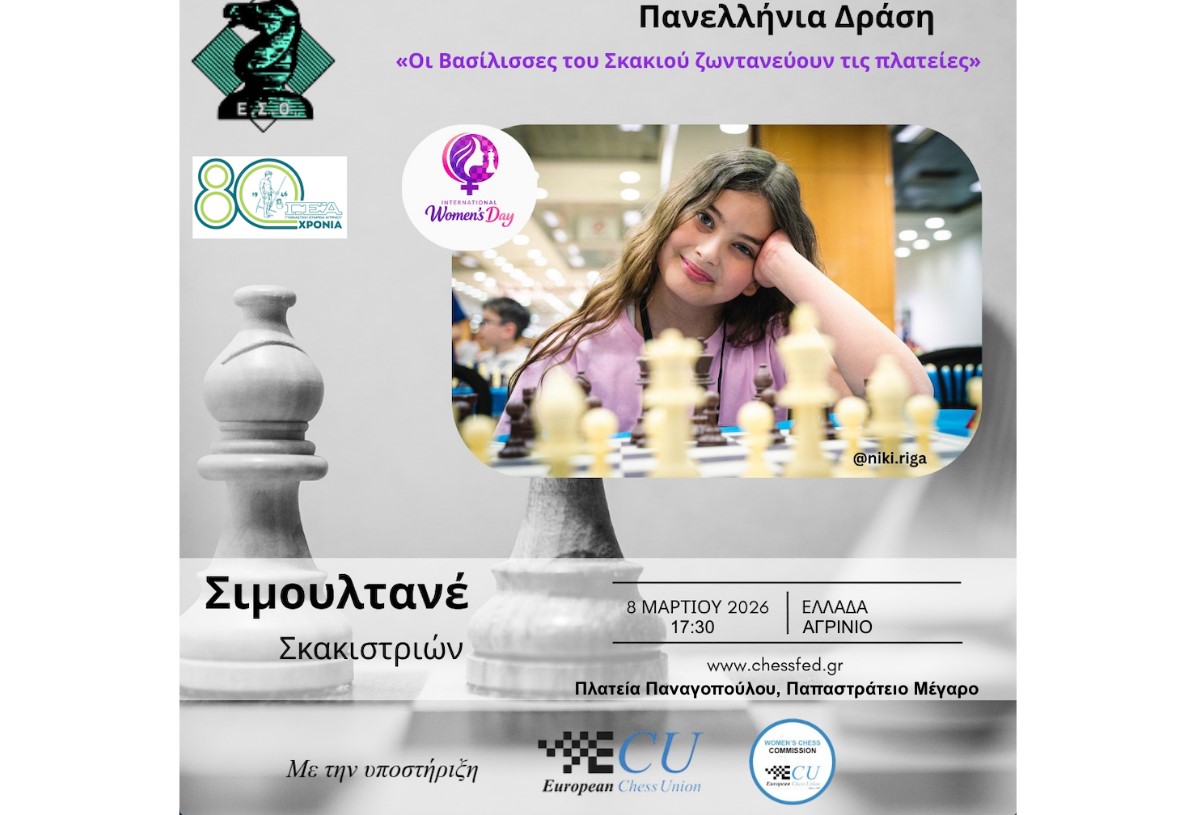Η Ελληνική Σκακιστική Ομοσπονδία (ΕΣΟ) διοργανώνει, με την υποστήριξη της European Chess Union (ECU), μια σημαντική Πανελλήνια Δράση Σκακιού (ΠΔΣ), η οποία θα πραγματοποιηθεί ταυτόχρονα σε 12 σημεία σε όλη την Ελλάδα, με αφορμή την Παγκόσμια Ημέρα της Γυναίκας (8 Μαρτίου).