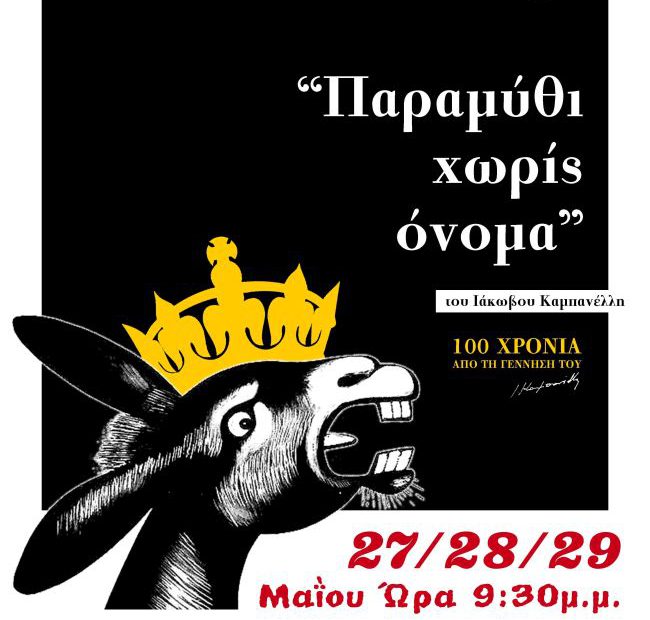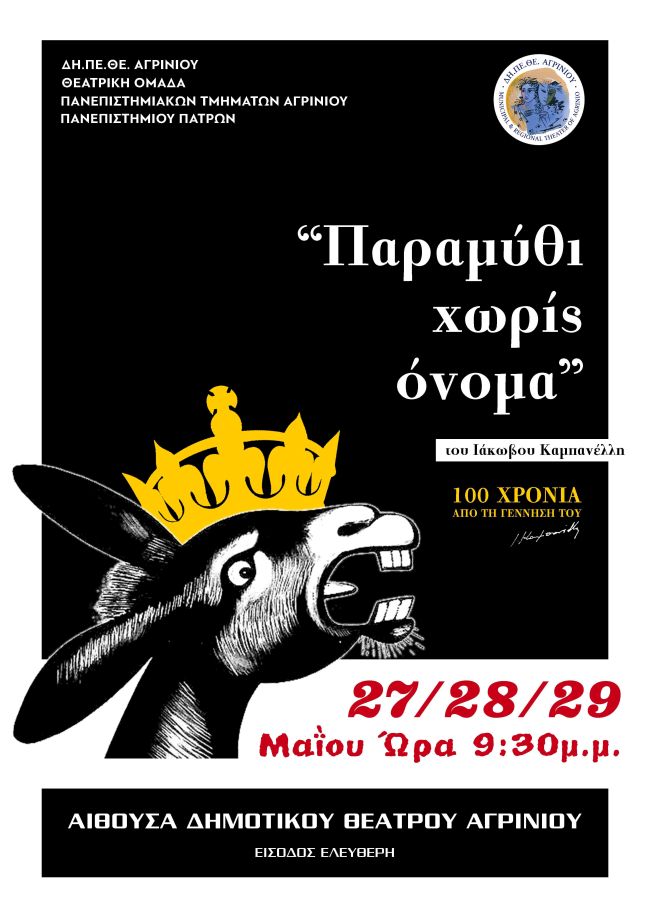 Το Δη.Πε.Θε. Αγρινίου και η Θεατρική Ομάδα Πανεπιστημιακών Τμημάτων Αγρινίου- Πατρών , συνεργάζονται για 16η συνεχή χρονιά, και παρουσιάζουν την παράσταση «ΠΑΡΑΜΥΘΙ ΧΩΡΙΣ ΟΝΟΜΑ» του ΙΑΚΩΒΟΥ ΚΑΜΠΑΝΕΛΛΗ, την Παρασκευή 27,το Σάββατο 28 και την Κυριακή 29 Μαΐου στις 9.30 μ.μ.στην αίθουσα του Θεάτρου.Με την παράσταση αυτή το Δη.Πε.θε. Αγρινίου συμμετέχει στις εκδηλώσεις για τον εορτασμό του έτους «ΙΑΚΩΒΟΥ ΚΑΜΠΑΝΕΛΛΗ 2022», με αφορμή τη συμπλήρωση 100 ετών από τη γέννησή του.