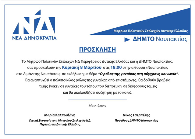 Το μητρώο πολιτικών στελεχών ΝΔ Περιφέρειας Δ.Ε και η ΔΗΜΤΟ Ναυπακτίας διοργανώνουν εκδήλωση για την γυναίκα
