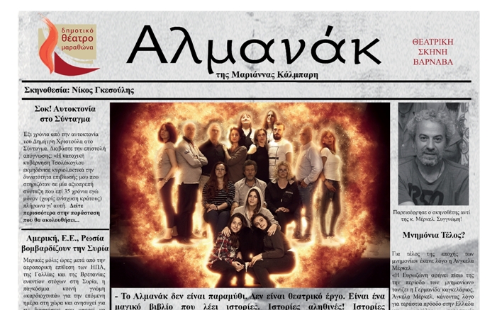 Φέτος έρχεται να μας παρουσιάσει τη δεύτερη παραγωγή της, το Αλμανάκ  ένα σύγχρονο ελληνικό πολιτικό έργο της Μαριάννας Κάλμπαρη, σε σκηνοθεσία Νίκου Γκεσούλη.