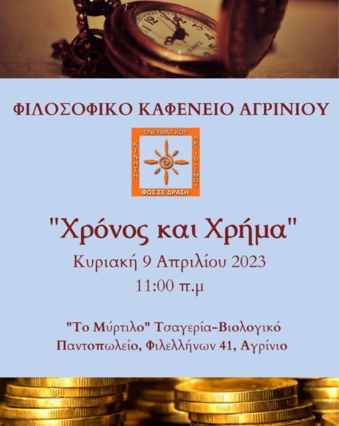 To ΦΙΛΟΣΟΦΙΚΟ ΚΑΦΕΝΕΙΟ ΑΓΡΙΝΙΟΥ με χαρά σας προσκαλεί στην πρώτη του συνάντηση με θέμα «Χρόνος και Χρήμα» την Κυριακή 9 Απριλίου, ώρα 11:00 π.μ. στον φιλόξενο χώρο «Το Μύρτιλο», Φιλελλήνων 41, Αγρίνιο.