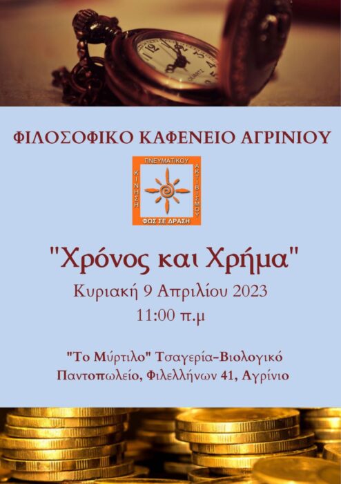 To ΦΙΛΟΣΟΦΙΚΟ ΚΑΦΕΝΕΙΟ ΑΓΡΙΝΙΟΥ με χαρά σας προσκαλεί στην πρώτη του συνάντηση με θέμα «Χρόνος και Χρήμα» την Κυριακή 9 Απριλίου, ώρα 11:00 π.μ. στον φιλόξενο χώρο «Το Μύρτιλο», Φιλελλήνων 41, Αγρίνιο.