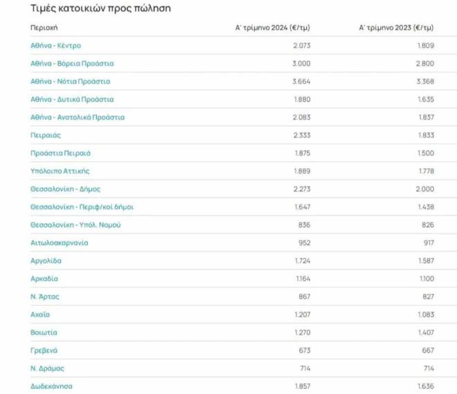 Στην Αθήνα, αύξηση 15% σημείωσαν οι τιμές πώλησης στα Δυτικά Προάστια, 14,60% στο κέντρο, 13,40% στα Ανατολικά Προάστια, 8,80% στα Νότια Προάστια και 7,10% στα Βόρεια Προάστια.