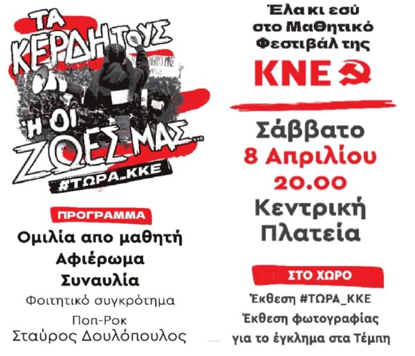 Το Σάββατο 8 Απριλίου στη κεντρική πλατεία Αγρινίου (πλατεία Δημοκρατίας) στις 20:00, θα διεξαχθεί το μαθητικό φεστιβάλ της ΚΝΕ στο Αγρίνιο, με σύνθημα «Τα κέρδη τους ή οι ζωές μας» ΤΩΡΑ_ΚΚΕ.