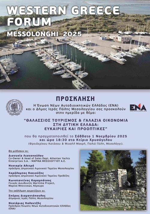 Η εκδήλωση πραγματοποιείται στο πλαίσιο του Western Greece Forum Messolonghi 2025, με στόχο την ανάδειξη των προοπτικών του θαλάσσιου τουρισμού και της γαλάζιας οικονομίας για τη βιώσιμη ανάπτυξη της Δυτικής Ελλάδας.