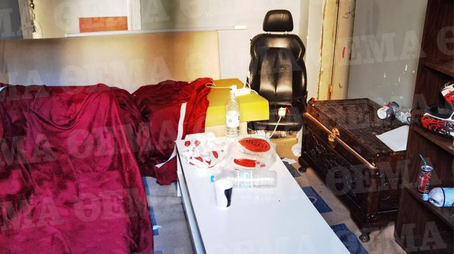 Μέσα στο σπίτι υπάρχει ένας καναπές στον οποίο οι 15χρονοι βασάνιζαν το ανυπεράσπιστο θύμα τους και διάσπαρτα αντικείμενα, από χειροπέδες μέχρι κράνη