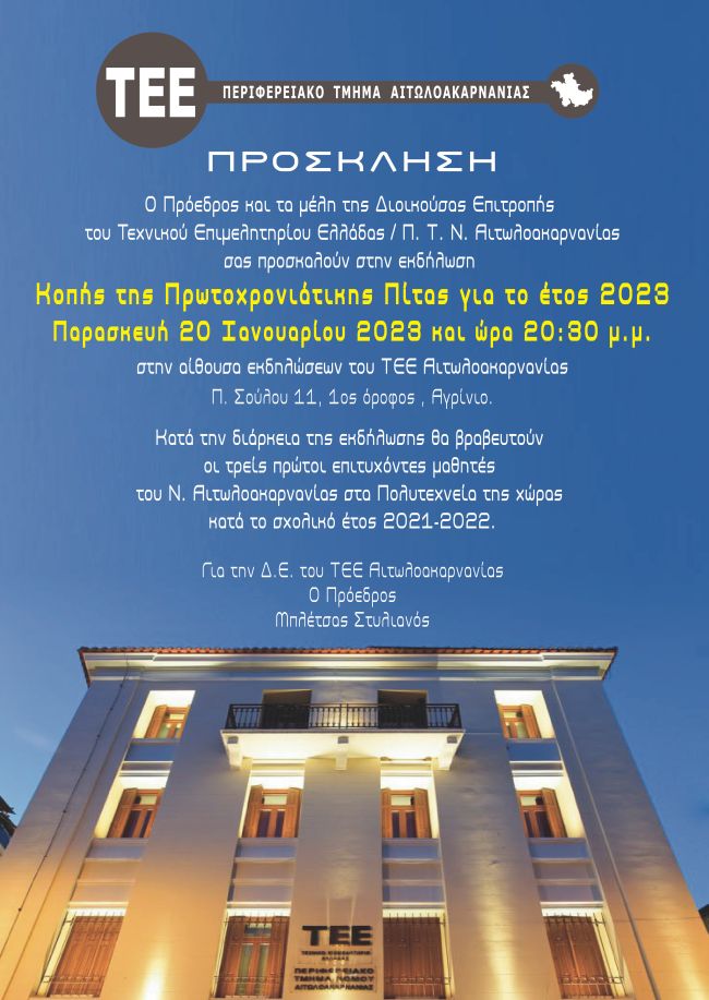 Ο πρόεδρος και τα μέλη της Διοικούσας Επιτροπής του ΤΕΕ Ελλάδος / ΠΤΝ Αιτωλοακαρνανίας σας προσκαλούν στην εκδήλωση κοπής της πρωτοχρονιάτικης πίτας για το 2023.