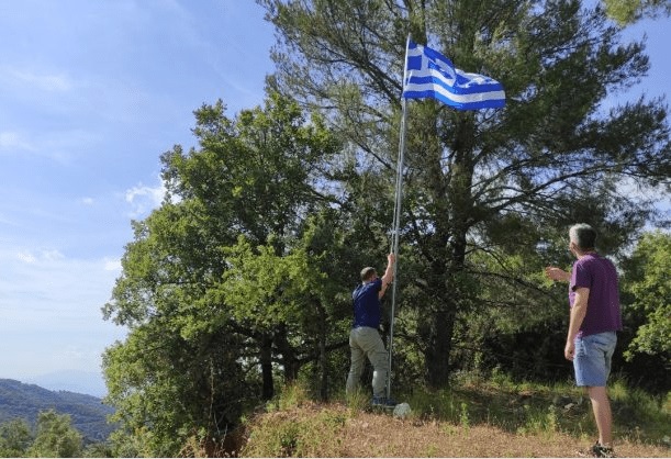 Τρεις νέοι ύψωσαν ξανά την σημαία στον δοκό ύψους 5,5 μέτρων στον Άγιο Νικόλαο στα Καραχαλέϊκα Γαβαλούς.