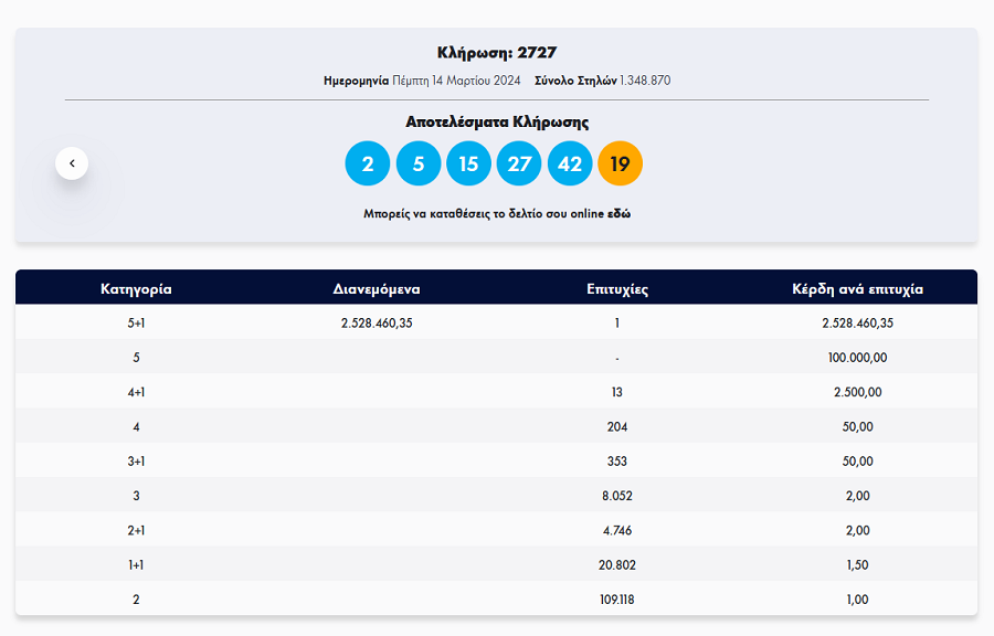 Οι τυχεροί αριθμοί που ανέδειξε η κληρωτίδα της αποψινής κλήρωσης είναι οι εξής: 2, 5, 15, 27, 42 και αριθμός Τζόκερ το 19.