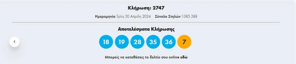 οι αριθμοί που εμφάνισε η κληρωτίδα είναι οι εξής: 18, 19, 28, 35, 36 και Τζόκερ ο αριθμός: 7