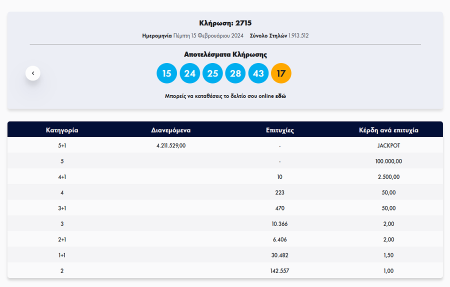Οι τυχεροί αριθμοί που ανέδειξε η κληρωτίδα της αποψινής κλήρωσης είναι οι εξής: 15, 24, 25, 28, 43 και αριθμός Τζόκερ το 17.