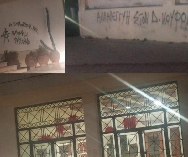 Τα ξημερώματα άγνωστοι βρέθηκαν στο χώρο της Περιφέρειας στο Μεσολόγγι, γράφοντας συνθήματα στους τοίχους και πέταξαν κόκκινη μπογιά στην πρόσοψη της κεντρικής εισόδου.