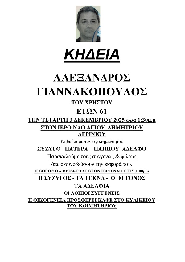 Βαθιά θλίψη σκόρπισε στο Αγρίνιο και την ευρύτερη περιοχή ο πρόωρος θάνατος του Αλέξανδρου Γιαννακόπουλου (ταπετσέρης και επισκευαστής επίπλων)