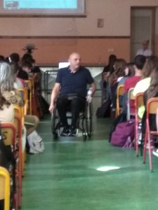 Στα πλαίσια διεξαγωγής βιωματικών δράσεων, επίσημος προσκεκλημένος της μαθητικής και εκπαιδευτικής κοινότητας, ήταν ο Παναγιώτης Αγγελούδης, την Παρασκευή 18 Οκτωβρίου 2019. Ο κος Αγγελούδης που είναι ενεργός αστυνομικός, αθλητής της καλαθοσφαίρισης, αλλά και πρωταθλητής επιτραπέζιας αντισφαίρισης, μετέφερε βιώματα από την δική του ζωή, με σκοπό να γίνει αντιληπτό στο τι εξυπηρετεί μία ράμπα στο δρόμο ή μία θέση στάθμευσης ΑΜΕΑ σε ένα σούπερ μάρκετ. Στην αρχή της συγκεκριμένης δράσης προβλήθηκε βίντεο, για να διαπιστωθεί το τι μπορεί να κάνει ένας άνθρωπος που είναι καθισμένος σε αμαξίδιο και το τι δεν μπορεί να κάνει όταν έχει, για παράδειγμα, καταληφθεί μία θέση στάθμευσης που του ανήκει.
