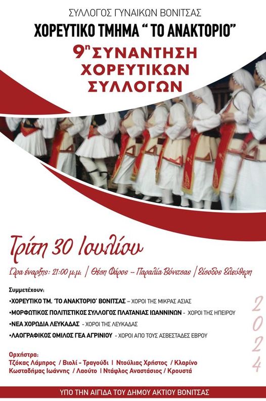Ο σύλλογος Γυναικών Βόνιτσας και το Χορευτικό του τμήμα ΄Το Ανακτόριο΄ διοργανώνει την 9η Συνάντηση Χορευτικών συλλόγων την Τρίτη 30/07/2024 και ώρα 21.00μμ στην παραλία της Βόνιτσας, στη θέση Φάρος, με την συνοδεία της παραδοσιακης ορχήστρας του κ. Λάμπρου Τζόκα και την συμμετοχή χορευτικών συλλόγων της ευρύτερης περιοχής Ιωαννίνων, Λευκάδας και Αιτ/νιας.