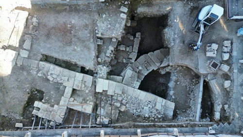 Ήδη, στη διάρκεια εργασιών αναβάθμισης του οδικού συστήματος που πραγματοποιήθηκαν στα τέλη του 2024, η απομάκρυνση του παλιού πεζοδρομίου, είχε αποκαλύψει ένα τμήμα του κοίλου (της ημικυκλικής κερκίδας, το τμήμα του θεάτρου όπου κάθονταν οι θεατές). Η εντελώς αναπάντεχη ανακάλυψη, η οποία τράβηξε αμέσως το ενδιαφέρον των αρχαιολόγων ήταν πως, ορισμένες από τις σημαντικές δομές των τειχών, βρίσκονταν στην άμεση εγγύτητα του αμφιθεάτρου, έξω από την περίμετρό του και ακριβώς στα βόρεια.