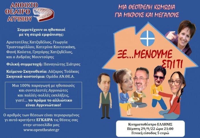 Συνεχίζονται με εντατικό ρυθμό οι πρόβες από το θεατρικό μας έργο “Ξε…Μένουμε σπίτι”, με στόχο να είναι πανέτοιμοι στην πρεμιέρα που θα γίνει την Πέμπτη 29/9/22 και ώρα 21:00 στο κινηματοθέατρο Ελληνίς Αγρινίου.