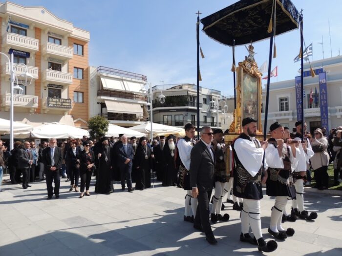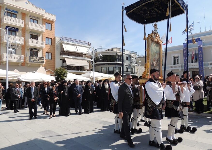 Στη συνέχεια, με λιτανευτική πομπή, μεταφέρθηκαν η Εικόνα της Εξόδου, το Ιερό Λάβαρο και ο Σταυρός Ευλογίας του Επισκόπου Ρωγών και Κοζύλης Ιωσήφ από το Μουσείο Ιστορίας και Τέχνης του Δήμου Ιεράς Πόλεως Μεσολογγίου, στον Ιερό Μητροπολιτικό Ναό Αγίου Σπυρίδωνος.