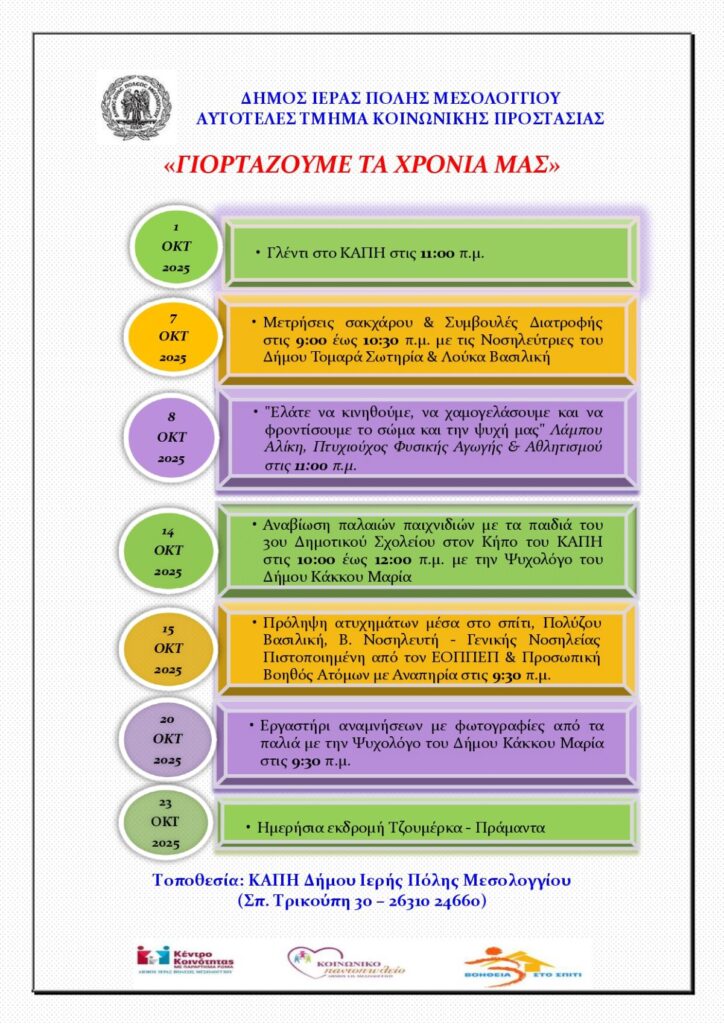 Ο τίτλος του φετινού προγράμματος είναι «Γιορτάζουμε τα Χρόνια μας» και στόχος του είναι να τιμήσει τους ανθρώπους της Τρίτης Ηλικίας, να αναδείξει τη συμβολή τους στην οικογένεια και στην κοινωνία, και να προσφέρει στιγμές χαράς, δημιουργικότητας και κοινωνικής επαφής.
