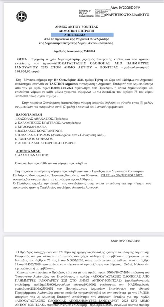 Με την υπ. αριθμ. 254/2024 απόφαση της Δημοτικής Επιτροπής του Δήμου Ακτίου-Βόνιτσας δημοπρατήθηκε το έργο «ΑΠΟΚΑΤΑΣΤΑΣΕΙΣ ΟΔΟΠΟΙΙΑΣ ΑΠΟ ΠΛΗΜΜΥΡΕΣ ΙΑΝΟΥΑΡΙΟΥ 2023 ΣΤΟ ΔΗΜΟ ΑΚΤΙΟΥ-ΒΟΝΙΤΣΑΣ», προϋπολογισμού 150.000€ και με συνολικό κόστος πράξης 190.000€ , καθώς προστέθηκαν 40000€ με ίδιους πόρους του Δήμου .Το συγκεκριμένο έργο αυτό την αποκατάσταση ζημιών δρόμων εντός οικισμών κοινότητας Τρύφου καθώς και της κοινότητας Δρυμού του Δήμου Ακτίου Βόνιτσας.