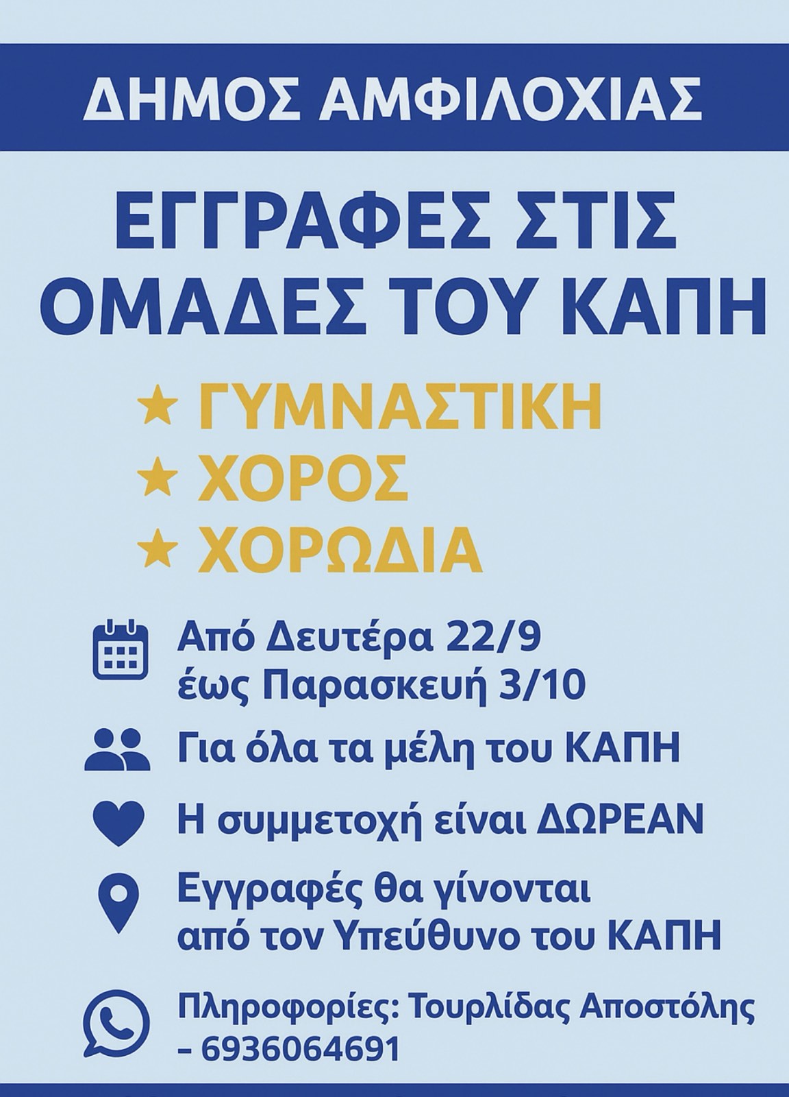 Ο Δήμος Αμφιλοχίας ενημερώνει ότι ξεκινούν τη Δευτέρα 22 Σεπτεμβρίου οι εγγραφές για τις ομάδες του ΚΑΠΗ για όλα τα μέλη του.